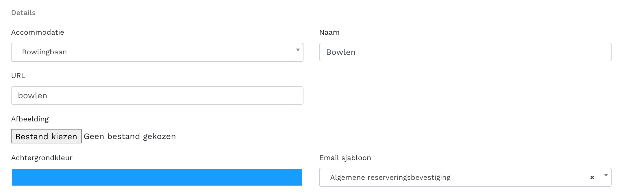 Bij details maak je de koppeling met de accommodatie waarin deze activiteit gaat plaats vinden. Daarnaast geef je de specifieke naam, url-slug, icoon, kleur voor het systeem op.