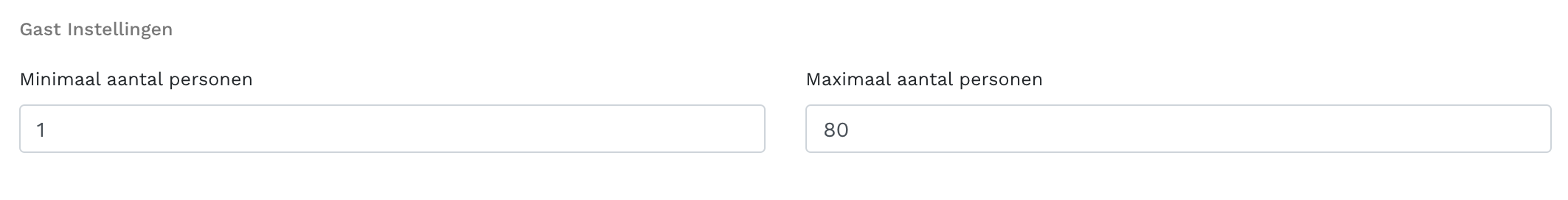 Hier bepaal je bij de reserveringen hoeveel minimaal en maximale gasten er mogen zijn (en dus de activiteit volledig is volgeboekt). In voorbeeld hieronder zou een reservering van 80 personen de gehele activiteit vol kunnen boeken (mits er plek is).
