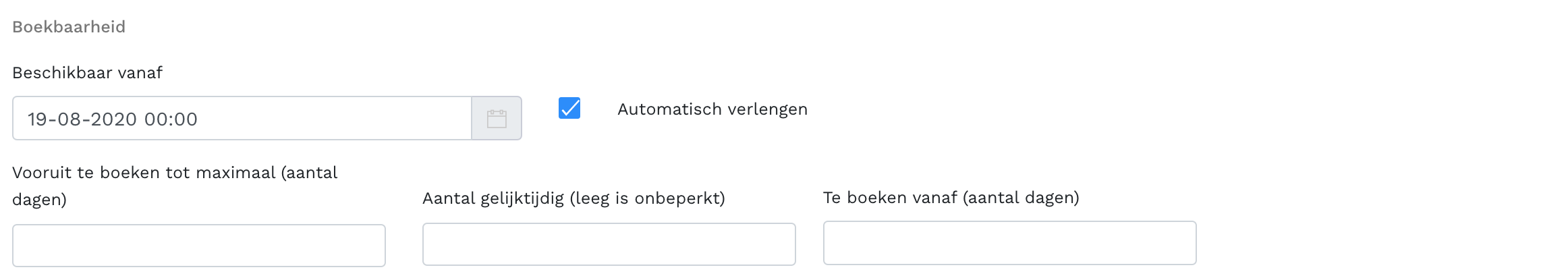 | Automatisch verlengen | Dan vervalt de optie ‘Beschikbaar tot’ het systeem zal namelijk zelf de activiteit einddatum met een jaar vooruit plannen per dag. Zodat je altijd tot 1 jaar in de toekomst kan boeken. |