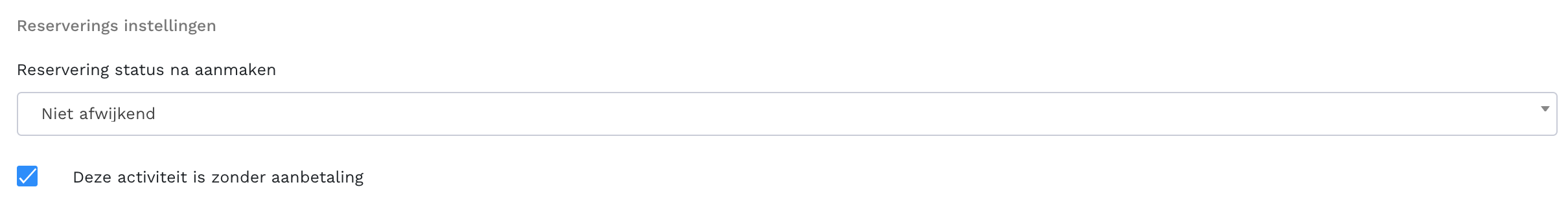 | Deze activiteit is zonder aanbetaling. | Wanneer je standaard voor iedere activiteit een aanbetaling verreist via Mollie, maar wilt dit net voor deze activiteit niet? Dan vink je deze optie aan. Een aanbetaling zal dan niet worden gevraagd door het systeem bij deze reservering. |