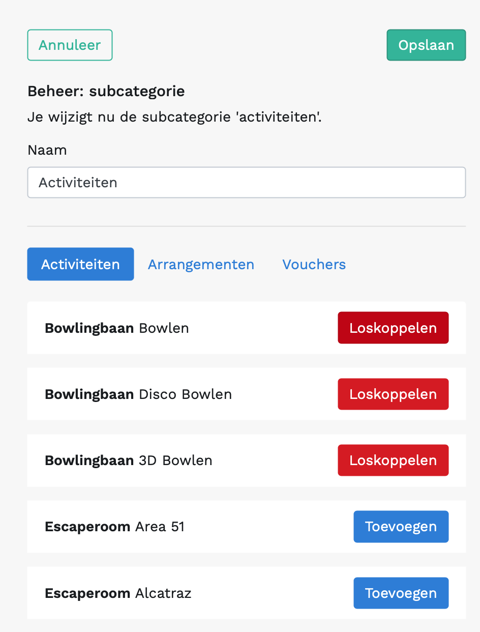 De linkerkant van je scherm zal nu een lijst weergeven van je activiteiten, arrangementen en vouchers. Je kunt hier het onderdeel toevoegen of loskoppelen aan de subcategorie.