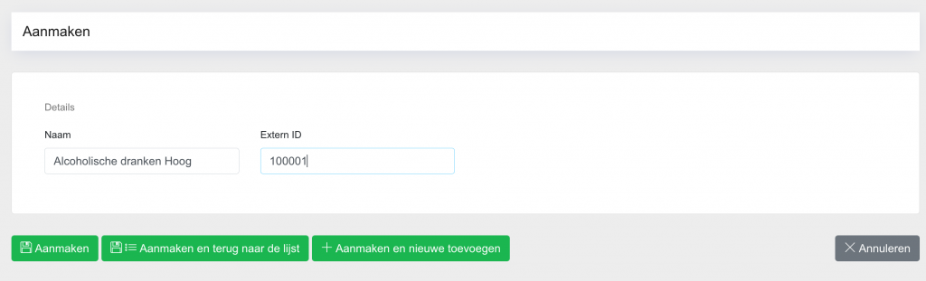 Geef een herkenbare naam op en een extern ID vanuit het artikel vanuit het kassasysteem. Deze kun je opvragen bij de kassaleverancier.