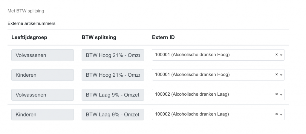 Ga nu naar het tabblad “Kassasysteem” en selecteer bij ‘Met BTW Splitsing’ voor iedere leeftijdsgroep in combinatie met het BTW Splitsings tarief het juiste ‘Externe ID’.