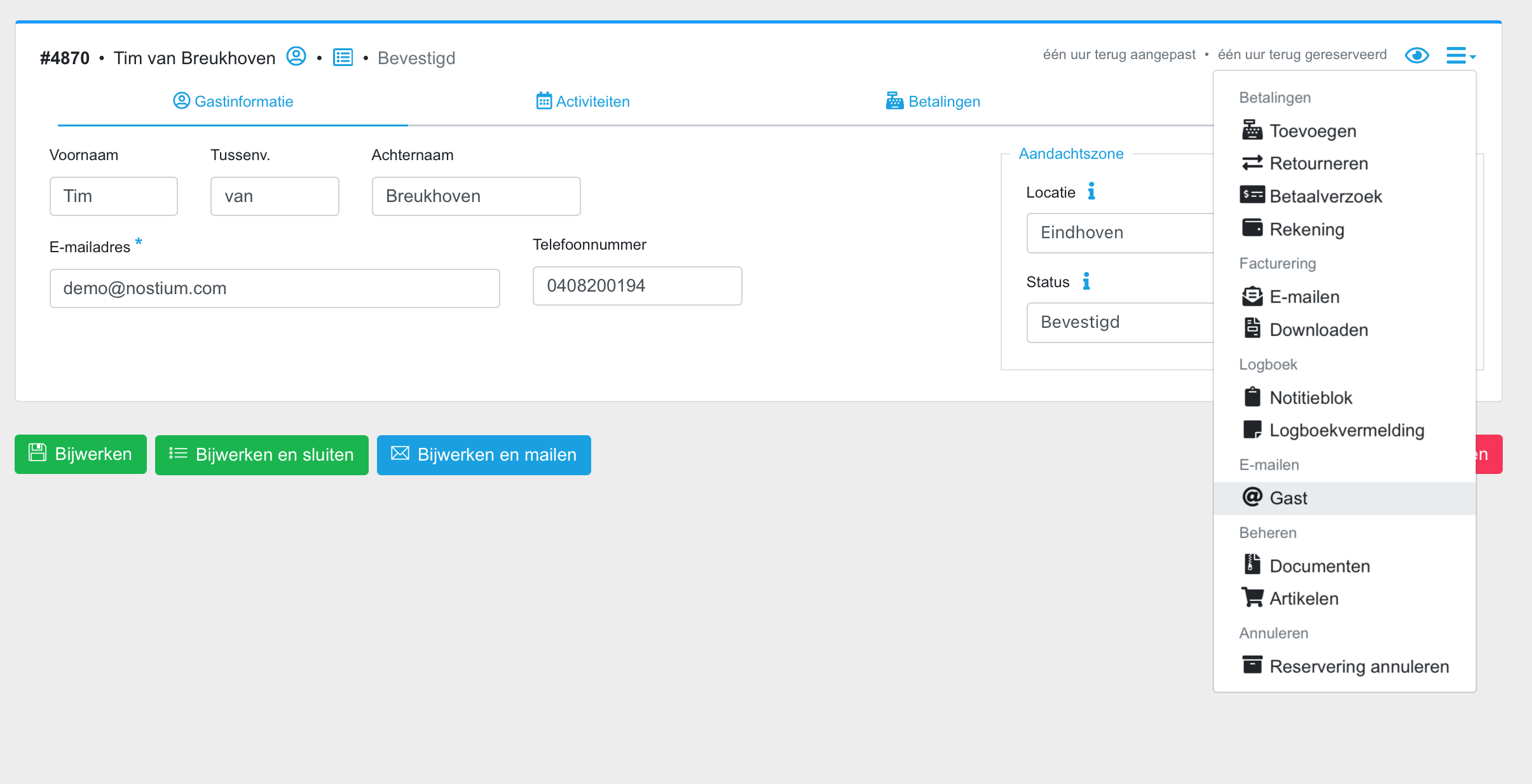 Wanneer je vanuit het systeem een reactie naar de gast wilt sturen of een e-mail wilt versturen over zijn/haar reserveringen, kun je dit eenvoudig doen via de backoffice.