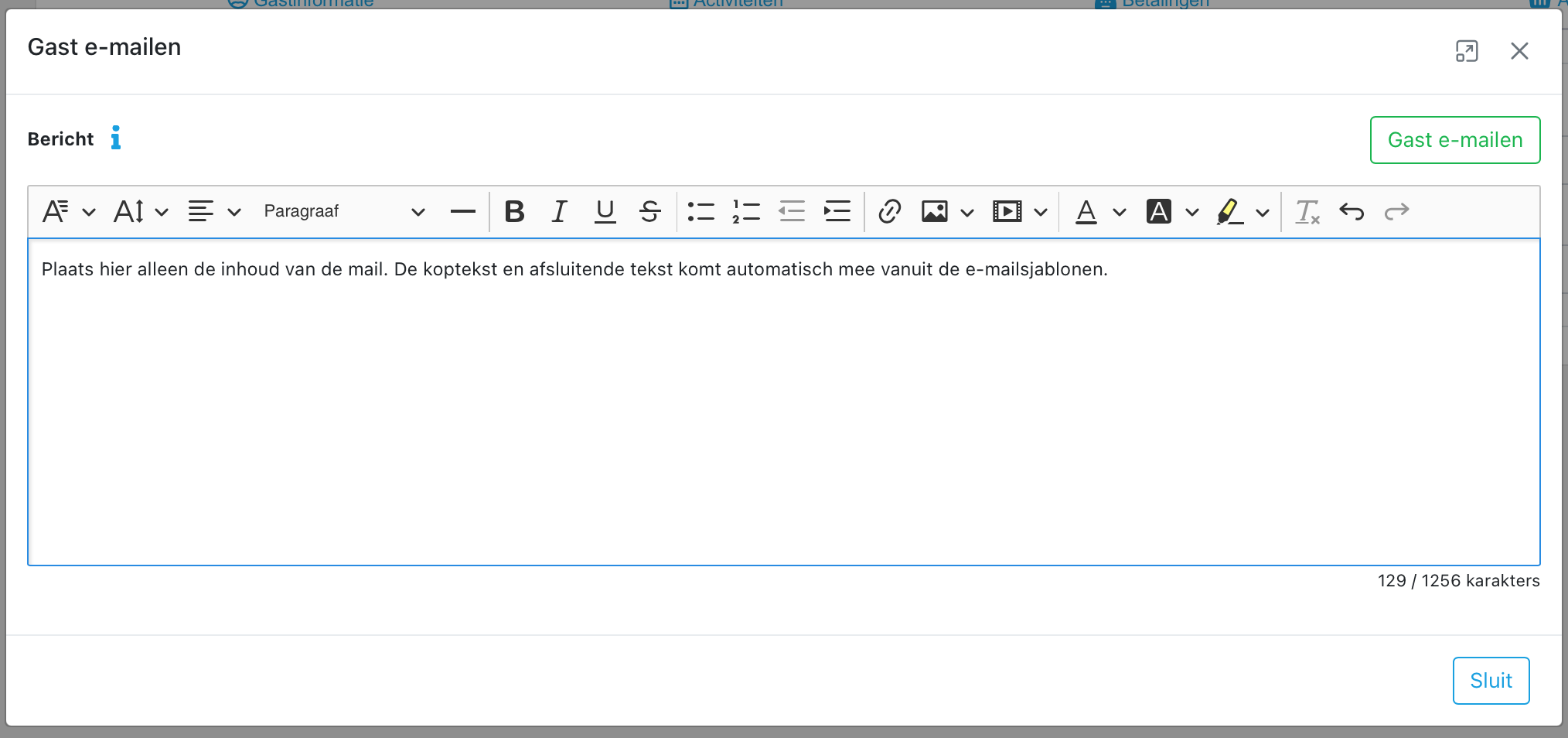Je kunt eenvoudig de inhoud die je aan de e-mail wilt toevoegen typen in het daarvoor bestemde venster. Wij zorgen ervoor dat de e-mail verder wordt opgemaakt en wordt verzonden naar het e-mailadres van de gast. Zodra je op ‘Verzenden’ drukt, wordt de e-mail direct verstuurd.