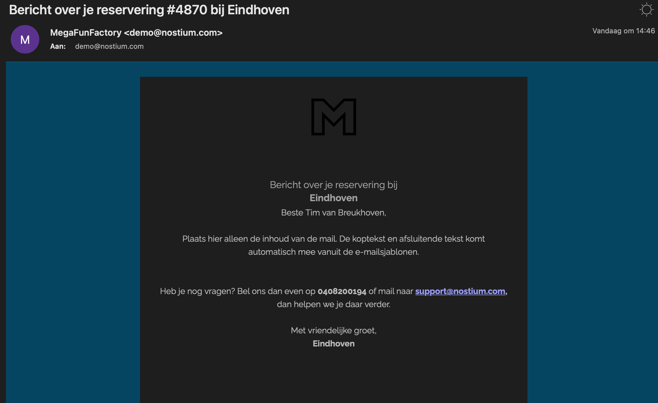 Het bericht wordt vervolgens in het “bericht aan gast” e-mail sjabloon in de volgende placeholder geplaatst: