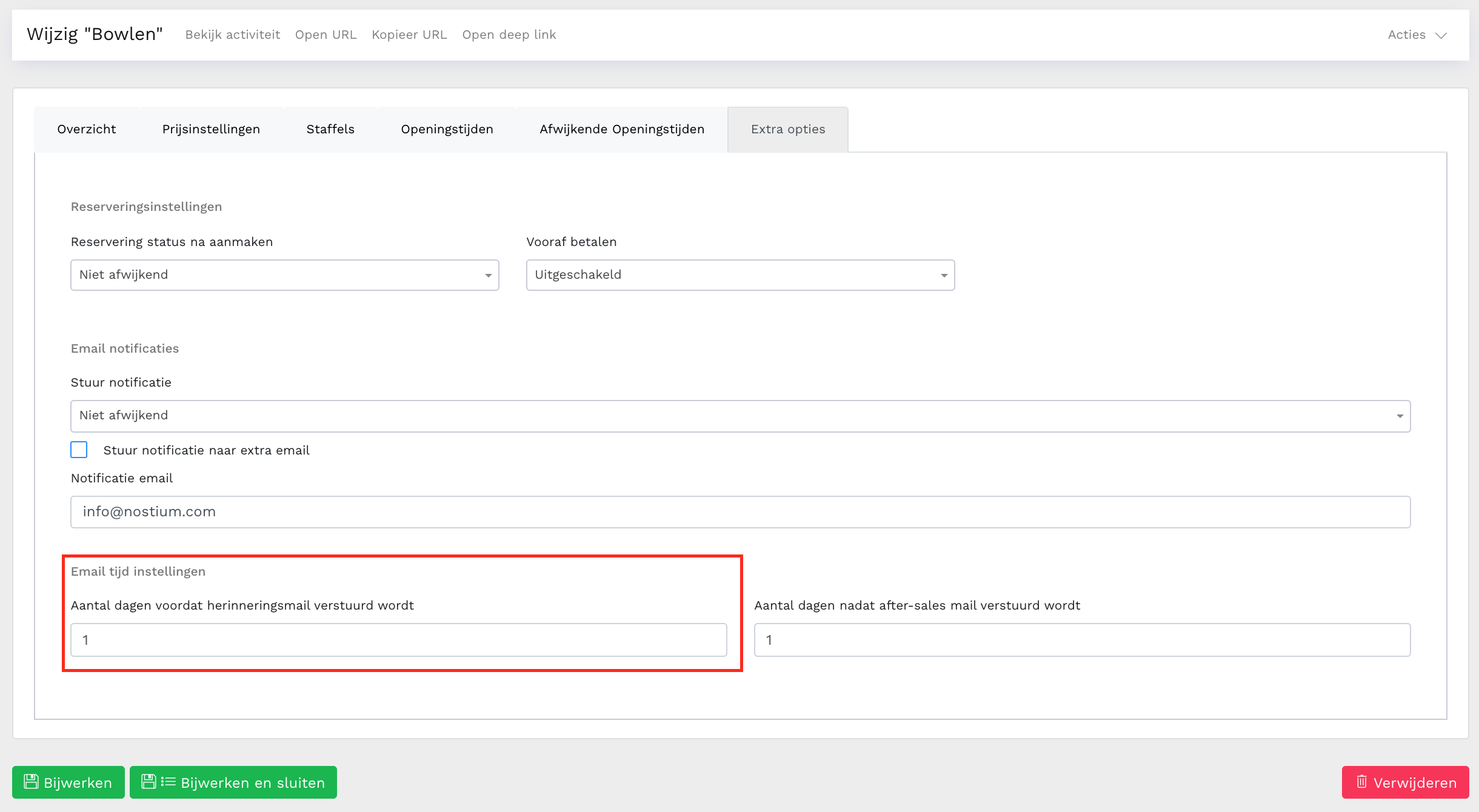 Stel in hoeveel dagen van te voren de gast extra geïnformeerd moet worden over de reservering.