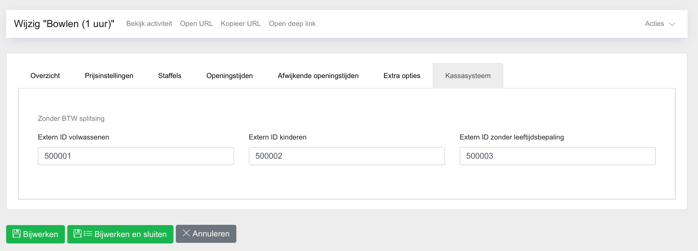Een vergelijkbaar scherm komt te voor schijn. Hier voor je het juiste externe ID in. Het is mogelijk om één extern ID in te voor alle prijzen.