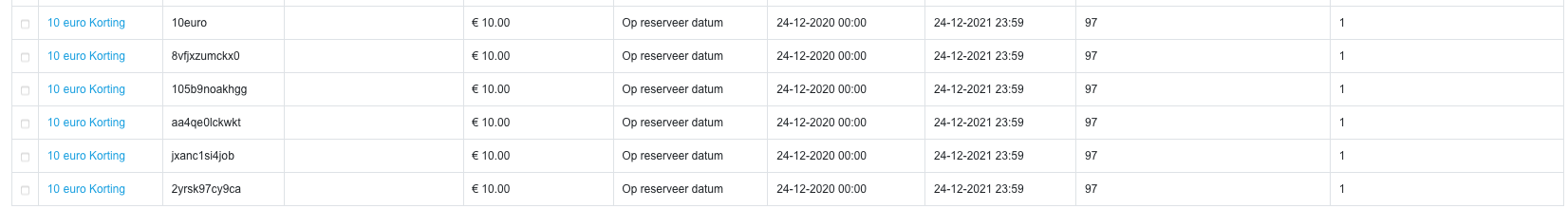 De kortingscode is dan succesvol gedupliceerd en zoals in het eerste screenshot te zien in herhaald met unieke kortingscodes.