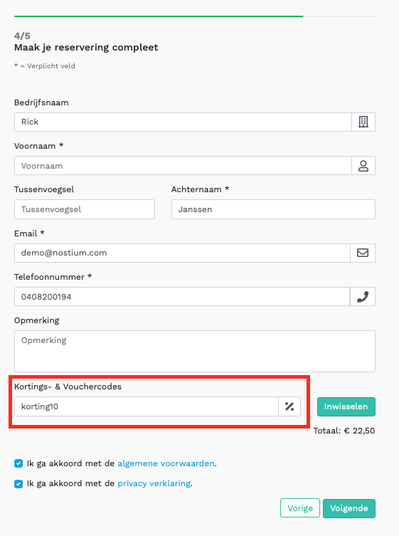 Wanneer de gast een reservering maakt zal bij de stap om de persoonsgegevens in te vullen. Zie je ook de mogelijkheid om een “Kortings- & Voucher codes” in te leveren.