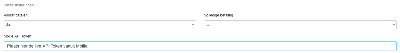 7. Bij ‘Mollie API Token’ dien je de juiste code vanuit Mollie te plaatsen. Gebruik de testcode om reserveringen te testen wanneer je nog niet online bent. Gebruik de live code wanneer er echt reserveringen gedaan kunnen worden