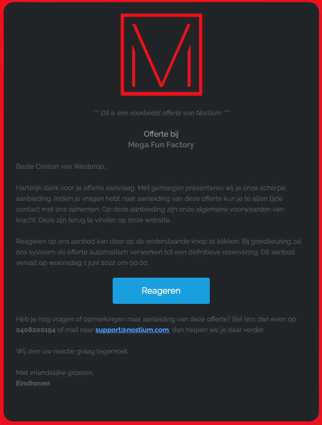 Reageren op ons aanbod kan door op de onderstaande knop te klikken. Bij goedkeuring zal ons systeem de offerte automatisch verwerken tot een definitieve reservering. Dit aanbod vervalt op %offerte_verval_datum% om %offerte_verval_tijd%.