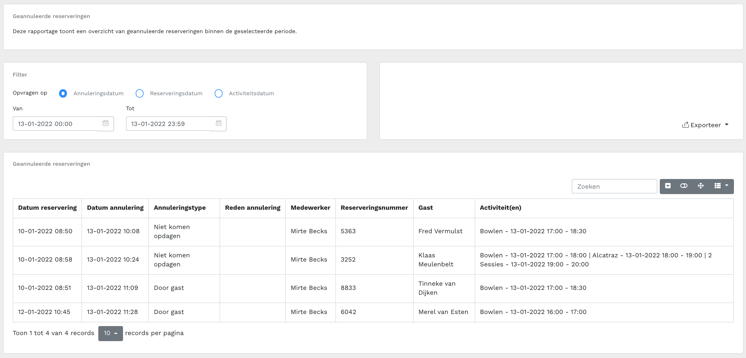 Navigeer binnen de back-office via het linker-menu naar [Rapportages → Geannuleerde reserveringen]