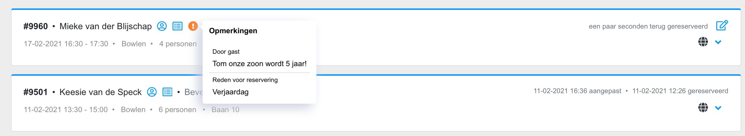 Zoek naar de betreffende reservering in de lijst. Wanneer je met je muis over het oranje uitroepteken icoon gaat, zul je hier de reserveringsreden en notitie zien.