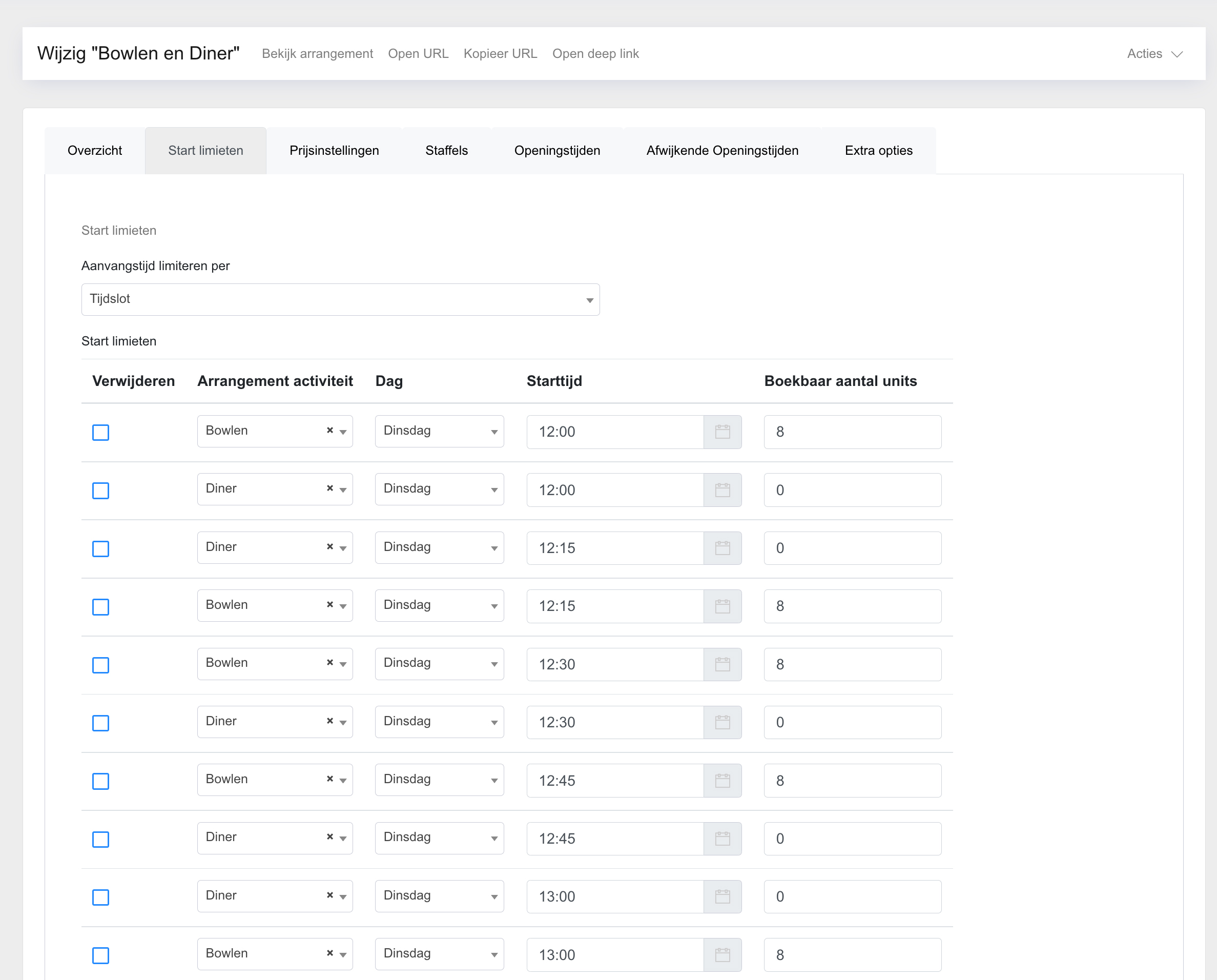 Wanneer je activiteit of arrangement een startinterval van 30 minuten heeft, moet er dus per half uur een start limiet ingesteld worden.