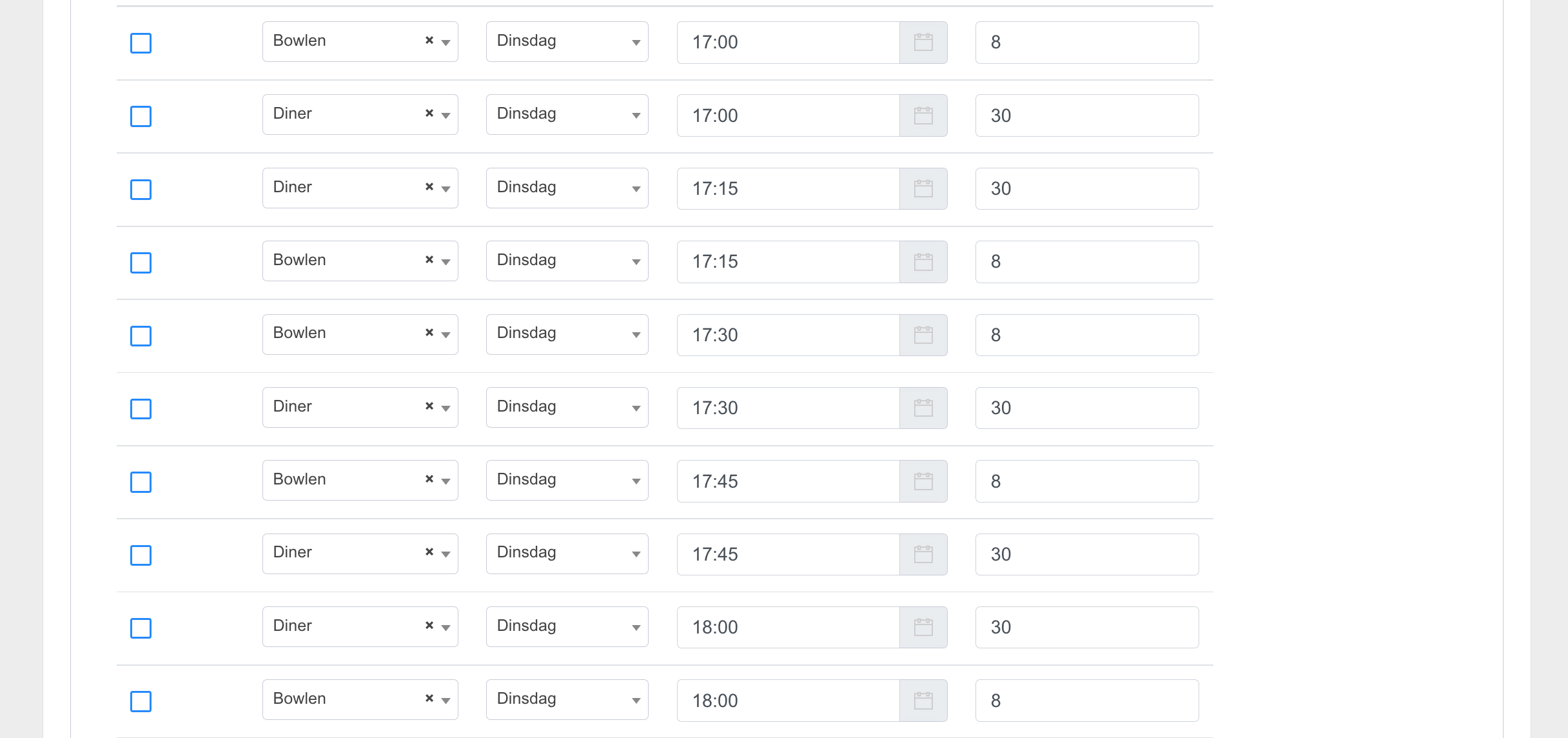 In het voorbeeld zie je vanaf 12:00 bij de activiteit ‘Bowlen’ altijd 8 staan om de 15 minuten. De 8 staan voor het aantal units dat op dit moment geboekt kunnen worden.
