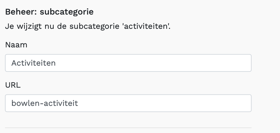 | URL | Vul hier het einde van de URL in dus bijvoorbeeld hoofdcategorie-subcategorie. Deze dient uniek te zijn. Hiermee creëer je een deeplink voor de subcategorie. |