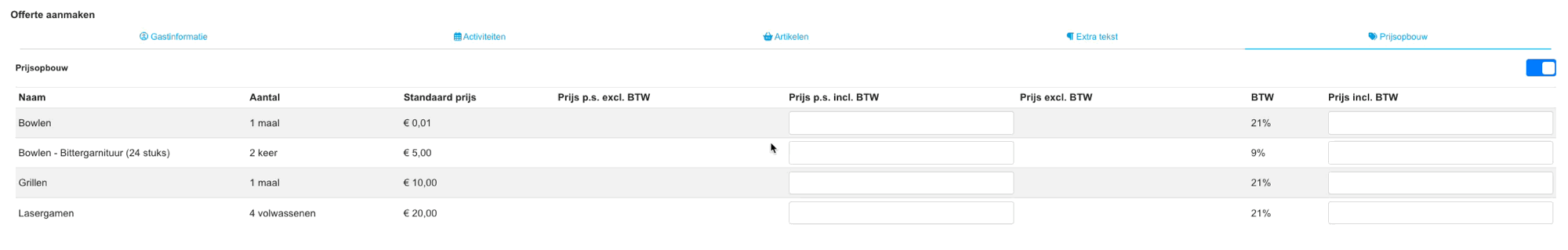 Zodra je binnen een offerte zit, ga naar het tabblad “Prijsopbouw”