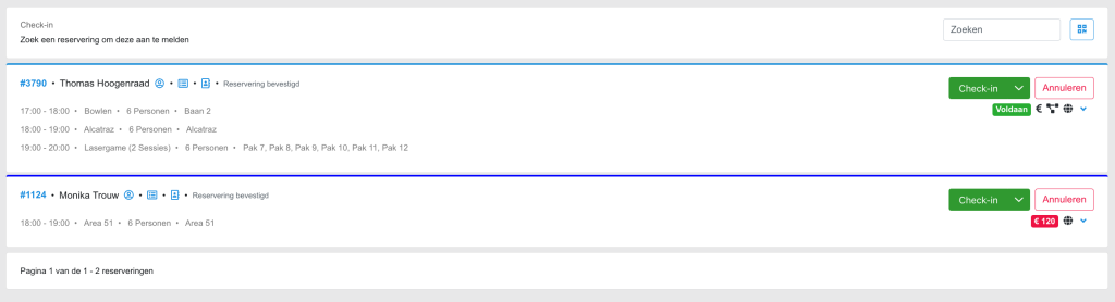Het systeem sorteert en toont elke reservering op basis van de aanvangstijd. Door op de knop “check-in” te klikken, meld je de reservering aan als status “in huis” of registreer je de reservering direct bij een gekoppeld kassasysteem als nieuwe order.